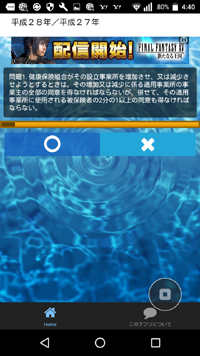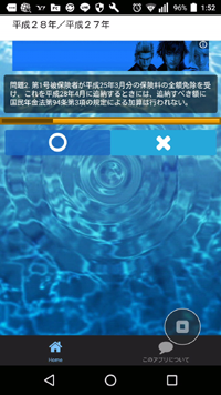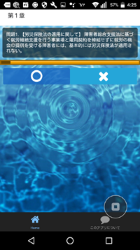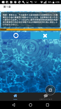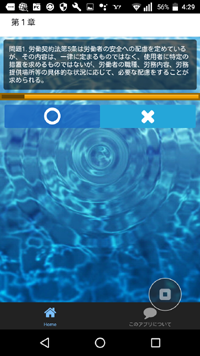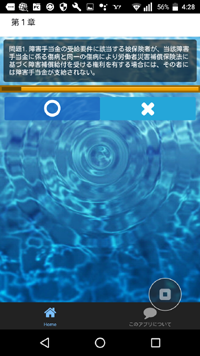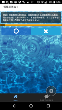 スマートフォン(Android)用のアプリで、科目別の過去問選択肢に対して○か×かの一問一答形式で回答します。